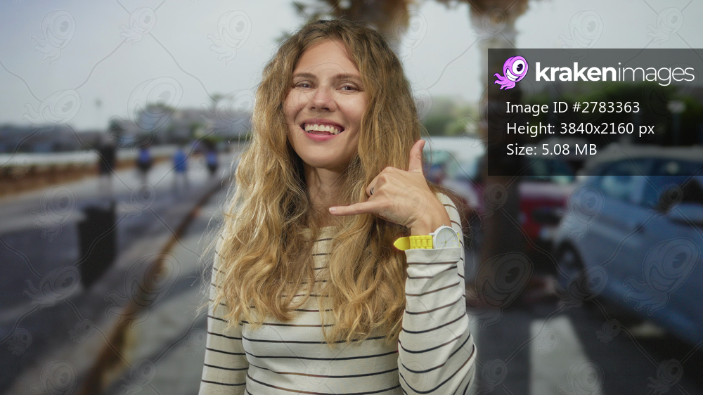 Woman lifts finger while pointing down a street, displaying blonde young confidence through a gesture to call the camera while smiling.