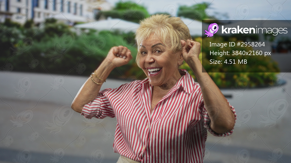 Woman lifts fists by ears and smiles in a sunny street plaza, wearing a red striped shirt and bracelets; joy celebration energy.