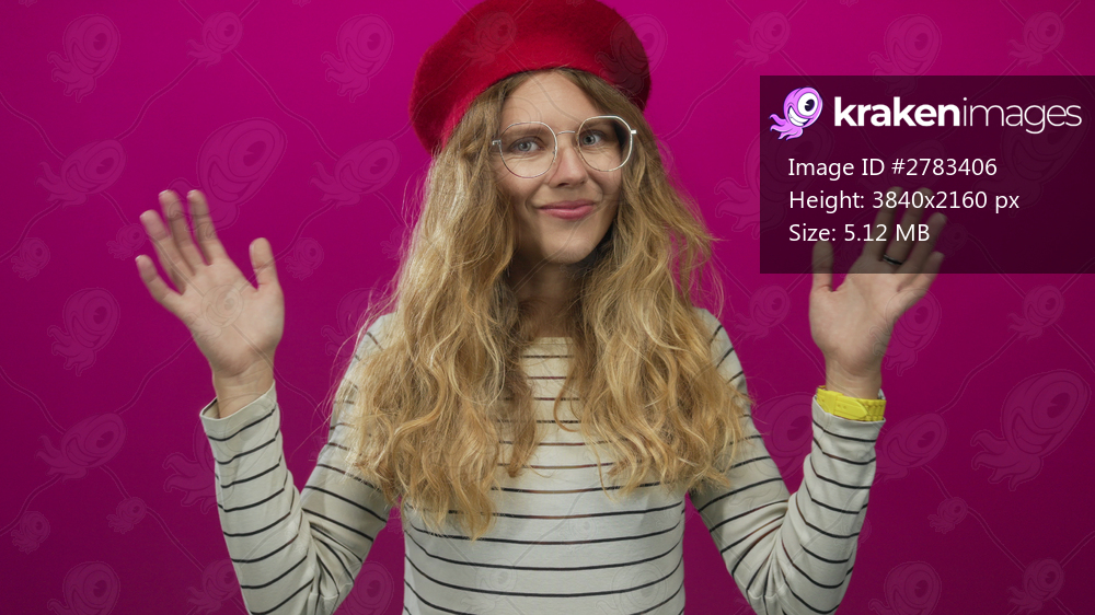 Woman lifts hands in wave gesture in studio setting, showcasing blonde young smile on pink background wearing beret.