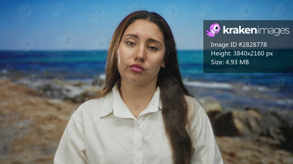 Woman lifts hands with palms open at rocky beach shore under bright sunlight with serious facial expression; serenity introspection reflection.