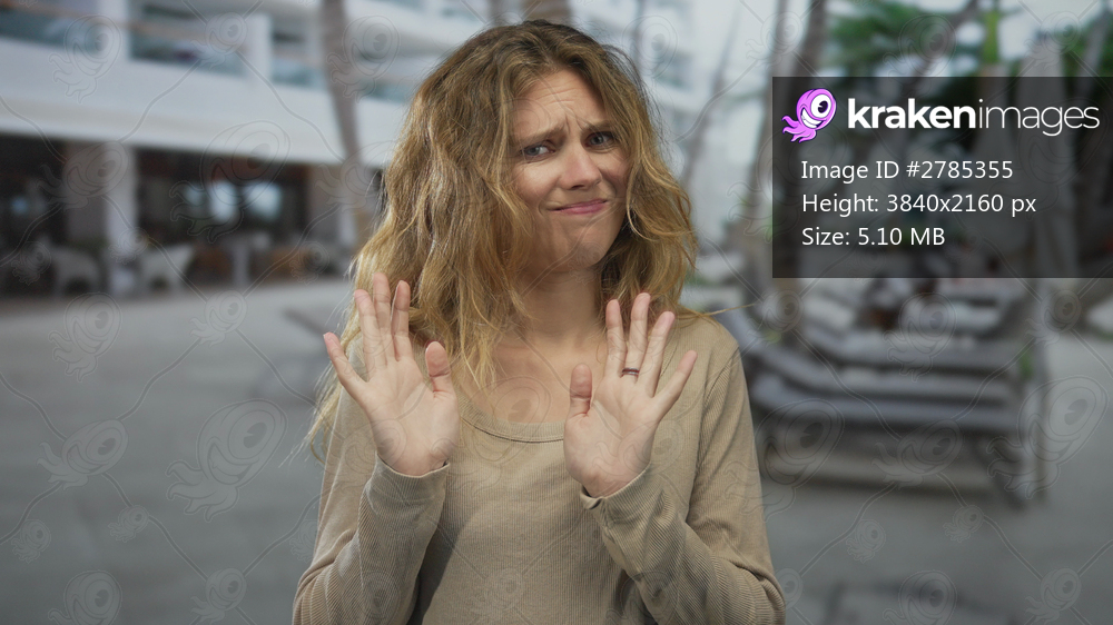 Woman lifts hands to refuse check in at pool resort where a blonde wearing casual lounge attire during vacation senses rejection.