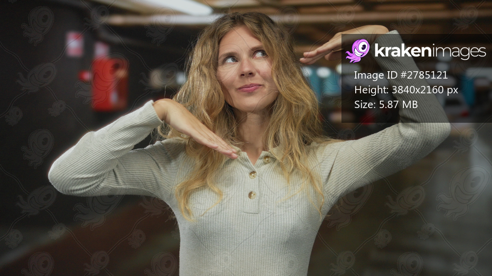 Woman lifts hands while smiling in a dimly lit parking garage, young blonde figure in playful gesture framing face elegantly.