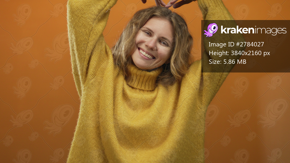 Woman lifts hands while smiling in a studio, her blonde young features framed by turtleneck, orange sweater for a cheerful mood.