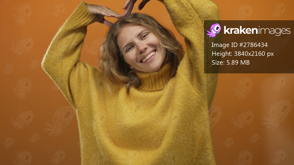Woman lifts hands while smiling in a studio, her blonde young features framed by turtleneck, orange sweater for a cheerful mood.