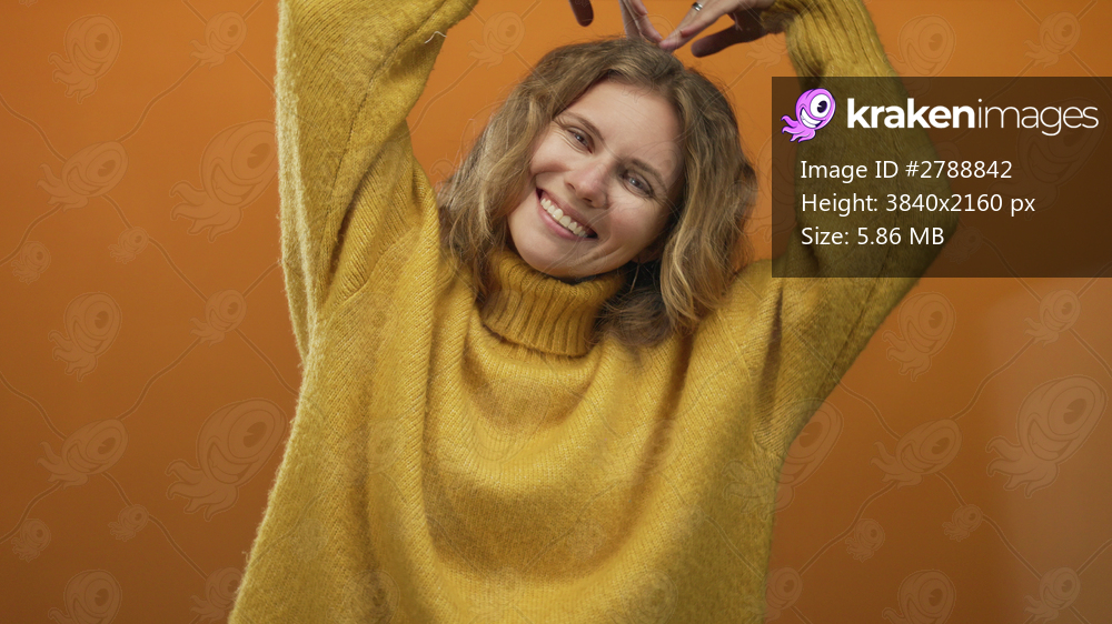 Woman lifts hands while smiling in a studio, her blonde young features framed by turtleneck, orange sweater for a cheerful mood.