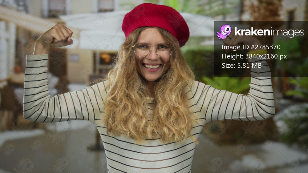 Woman lifts her arm flexing with pride in an outdoor scene as a blonde young happy individual wearing a beret and glasses at a cafe.