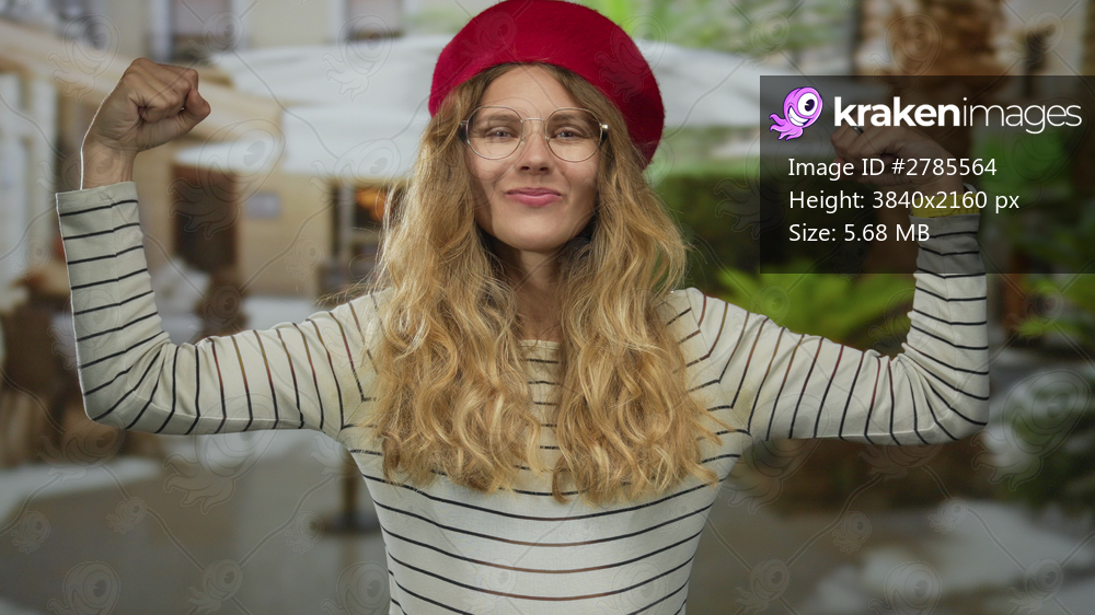 Woman lifts her arm flexing with pride in an outdoor scene as a blonde young happy individual wearing a beret and glasses at a cafe.