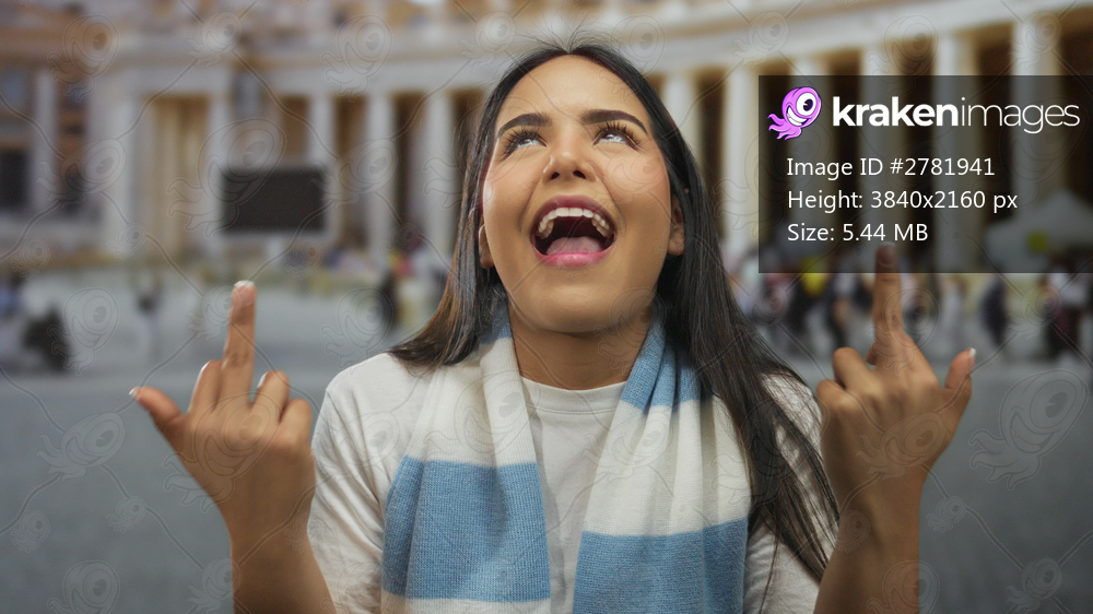 Woman lifts her finger, flipping a bold salute at vatican tourists while a young latin hispanic woman poses in square san pedro.