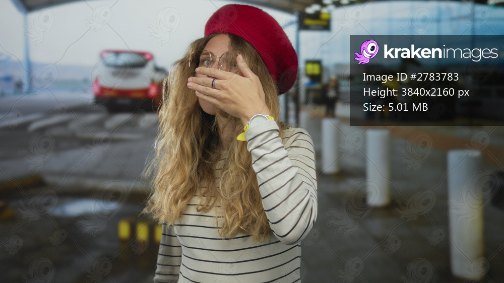 Woman lifts her hand shielding bright sun at an airport wearing a blonde beret and striped sweater with a yellow watch beside a car in the terminal.