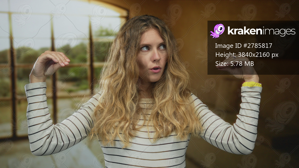 Woman lifts her hands while gossiping in an indoor scene, blonde young persona wearing a striped top near a window making mouths gesture.
