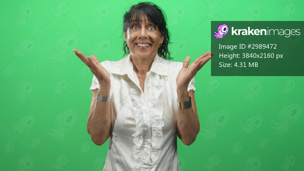 Woman lifts palms in a shrug gesture, white ruffled blouse and bracelets visible in a studio green screen setting; playful curiosity.
