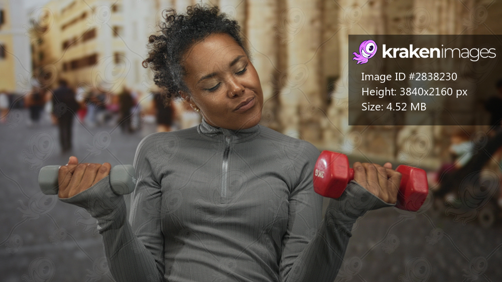 Woman lifts red dumbbells with flexed arms on busy street during intense workout session; empowerment.