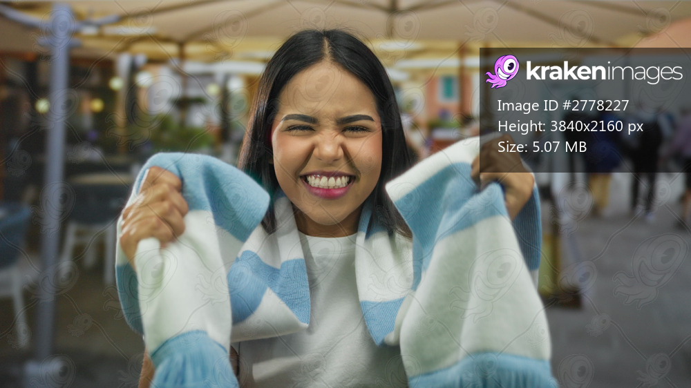 Woman lifts scarf while cheering at a restaurant with young latin hispanic friends on a terrace during an outdoor sports celebration.