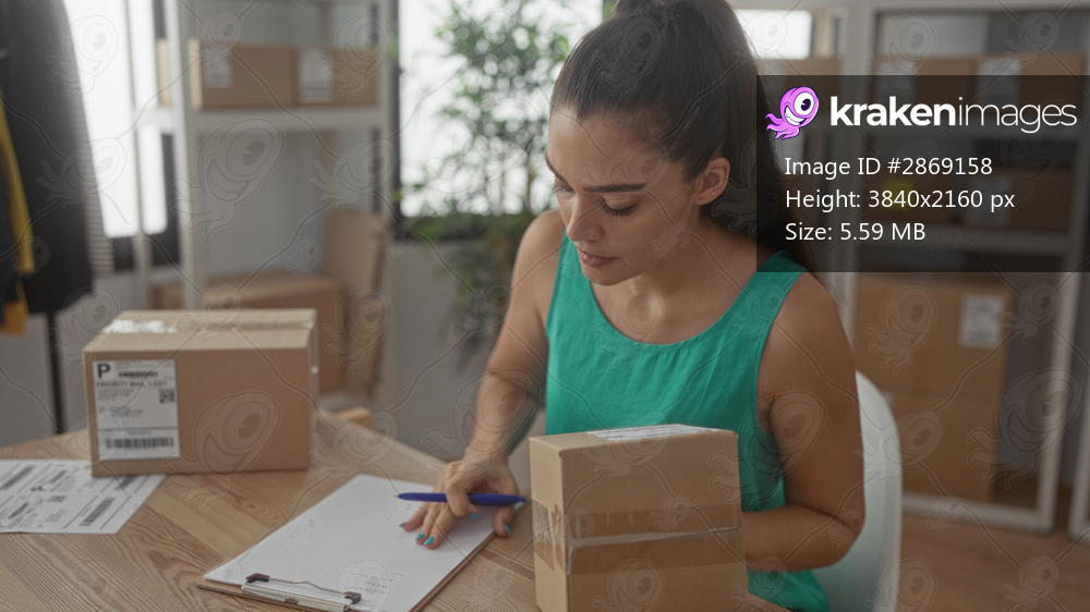 Woman lifts small cardboard package at desk in a sunlit building mailroom; determination and efficiency.