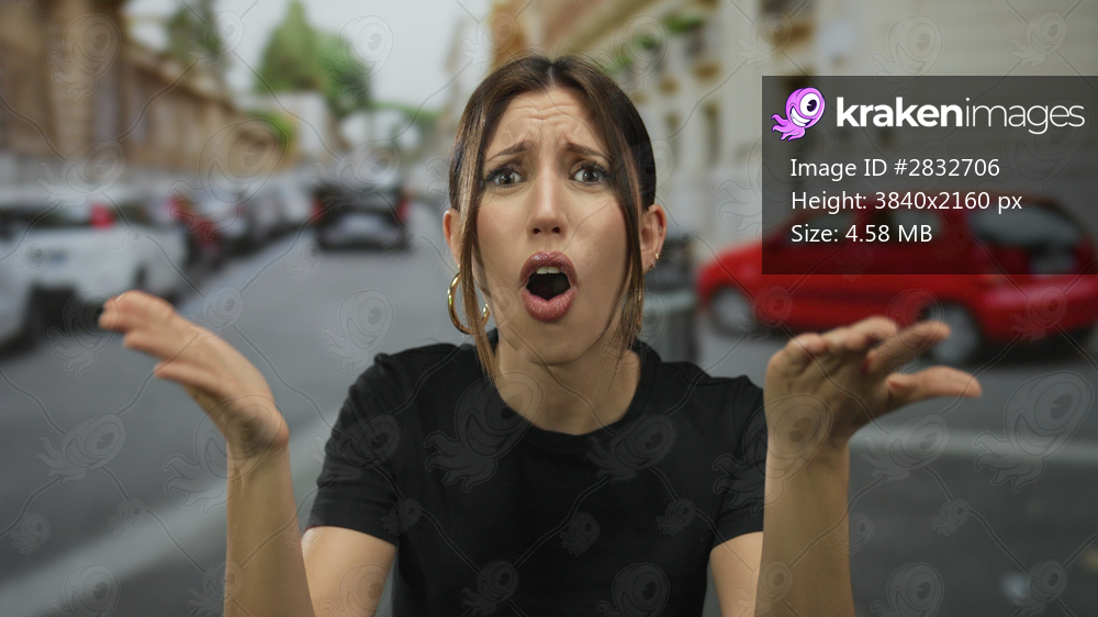Woman lifts upturned palms in questioning gesture beside parked cars on urban street with furrowed brow and open mouth; confusion.