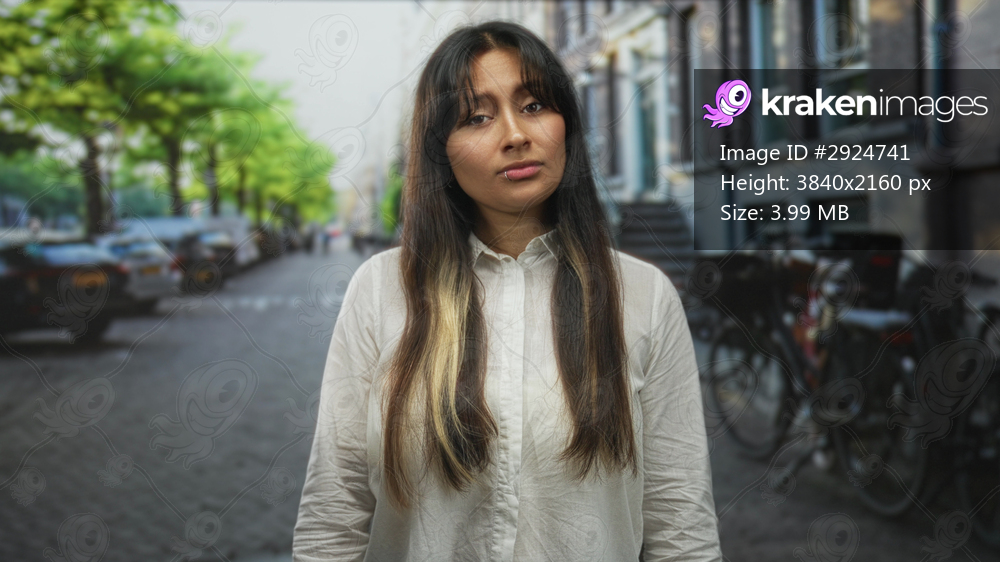 Woman with lip piercing standing on a city street with bicycles and parked cars on cobblestone pavement, neutral expression and hands at sides; quiet weariness. - Kraken Images