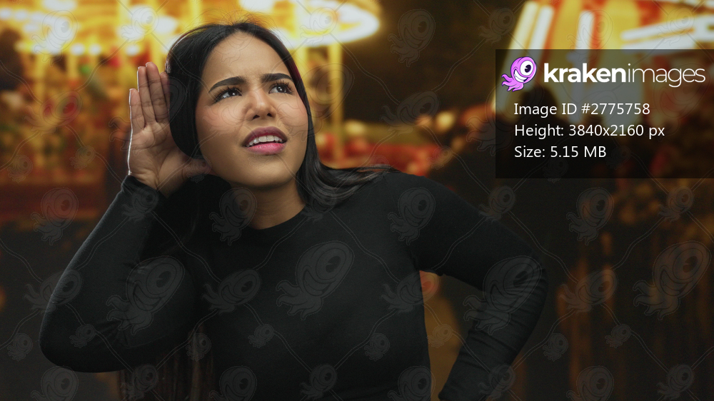 Woman listening at outdoor fair night scene with vibrant lights and crowd, showcasing lively atmosphere, amusement park excitement, and multicultural diversity. - Kraken Images