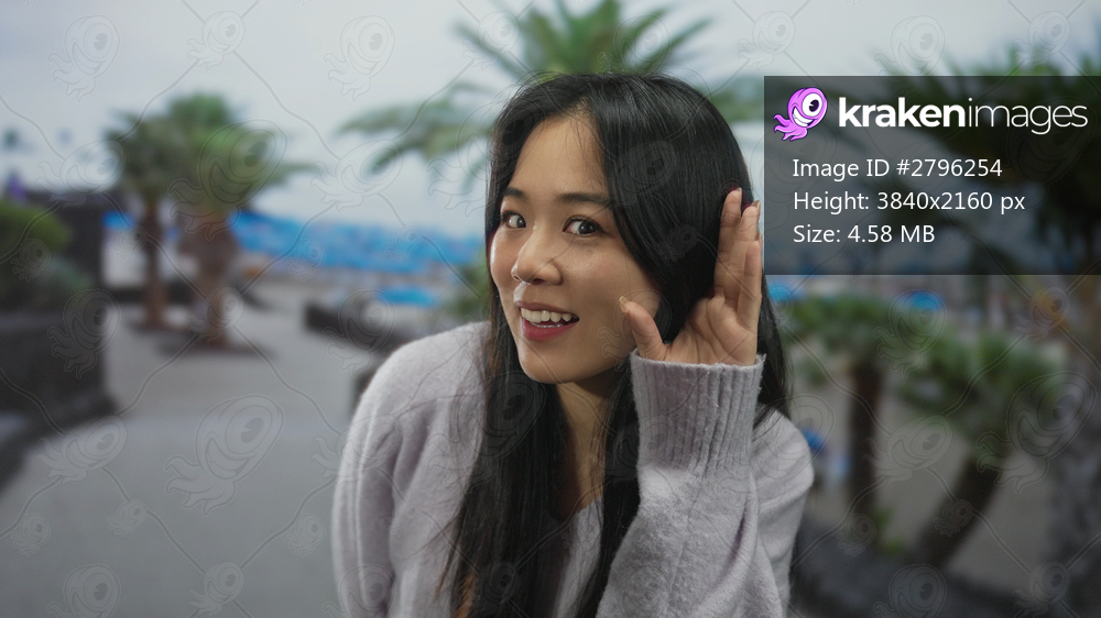 Woman listening attentively on a scenic seaside promenade, surrounded by palm trees and wearing a cozy sweater, capturing the joyful essence of a calm beach day outdoors. - Kraken Images