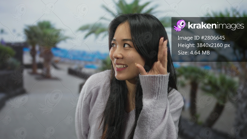 Woman listening attentively on a scenic seaside promenade, surrounded by palm trees and wearing a cozy sweater, capturing the joyful essence of a calm beach day outdoors. - Kraken Images