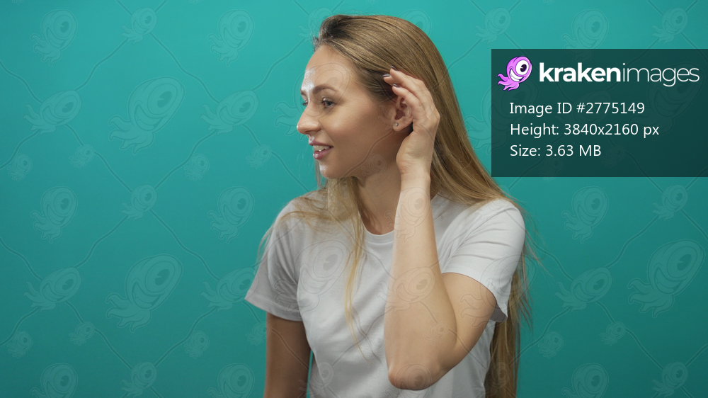 Woman listening with hand to ear wearing white shirt against blue background displaying curiosity and intrigue in an isolated setting.