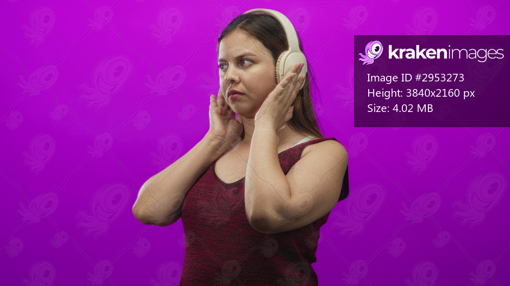 Woman listening with hands on headphones and closed eyes in a magenta studio; serenity focus mindfulness.