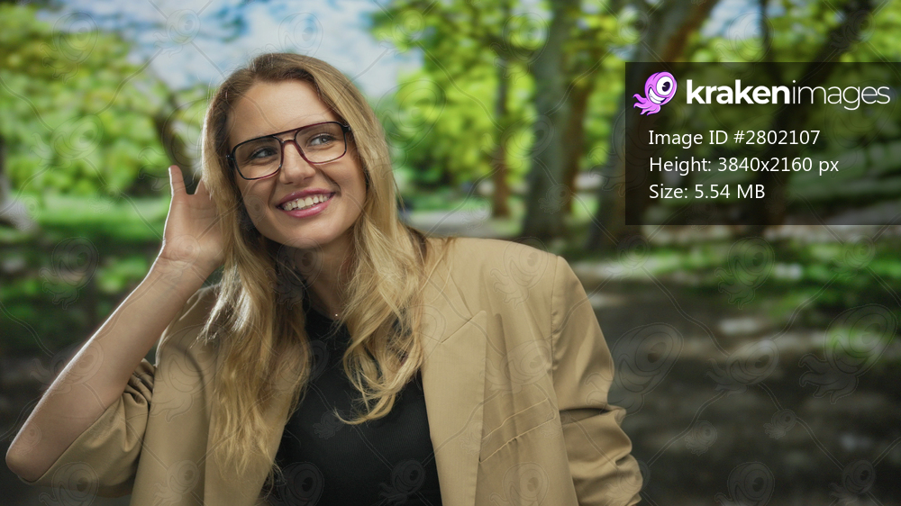 Woman listening in a park with a smile, blonde hair, glasses, and a beige coat surrounded by greenery and sunshine creating a relaxed outdoor atmosphere. - Kraken Images