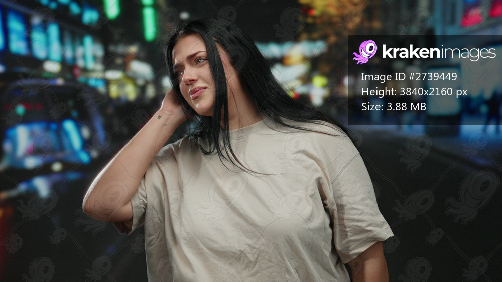 Woman listening intently with a hand to her ear on a busy city street at night, lights and blurred motion creating an urban backdrop, conveying curiosity and alertness. - Kraken Images