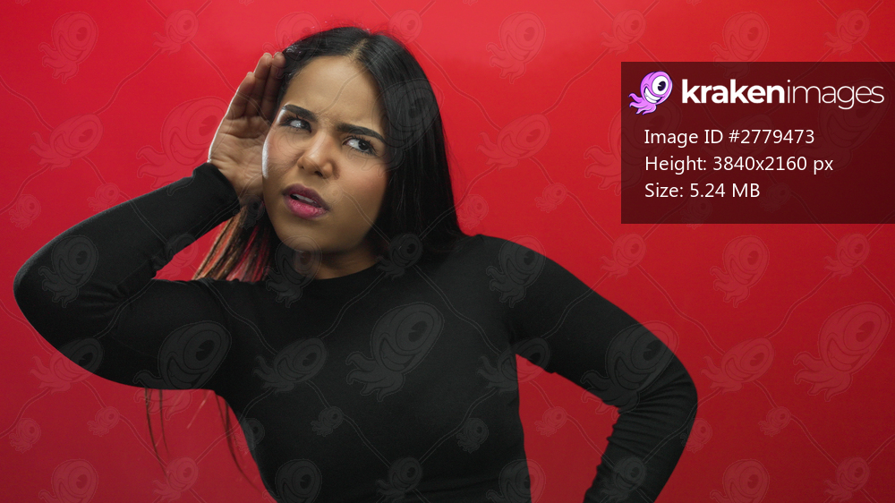 Woman listening intently with hand to ear against vibrant red wall wearing black outfit, displaying curious expression to depict attention and focus.