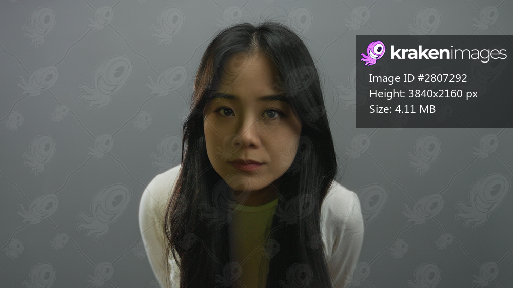 Woman with long black hair looks contemplative, standing against an isolated grey background, capturing an emotional and serene expression in a minimalist setting. - Kraken Images