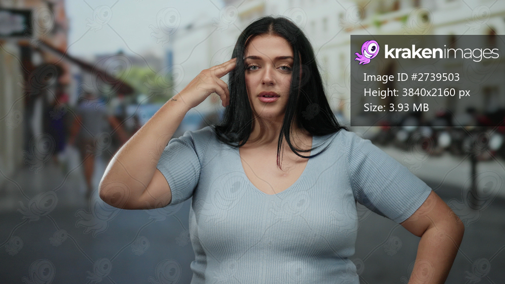 Woman with long black hair making a playful gesture on a bustling city street, wearing a blue shirt, capturing the essence of urban life.
