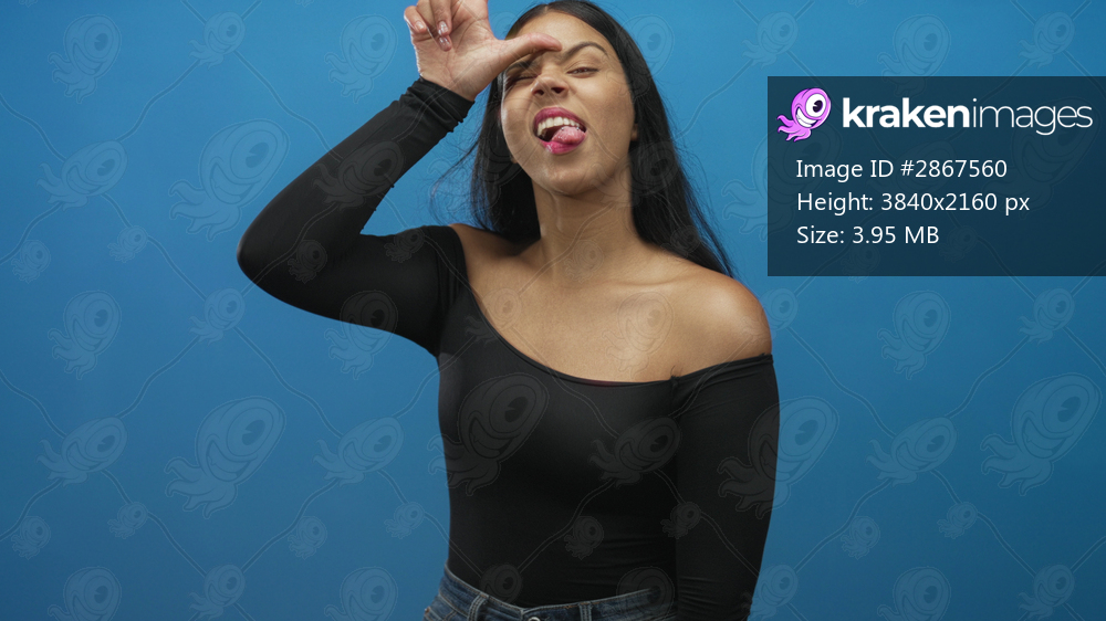 Woman with long black hair making loser sign on forehead and sticking tongue out in blue studio; defiance.