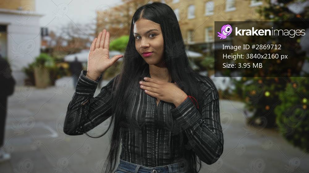 Woman with long black hair places left hand on chest and lifts right hand in oath gesture on a city street lined with buildings; sincerity.