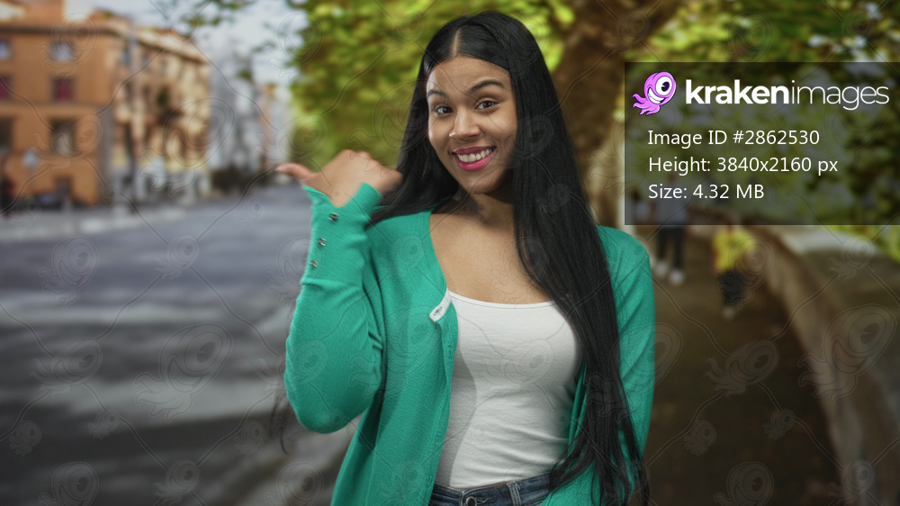 Woman with long black hair points thumb to bare shoulder on sunlit street lined with trees and buildings; confidence.