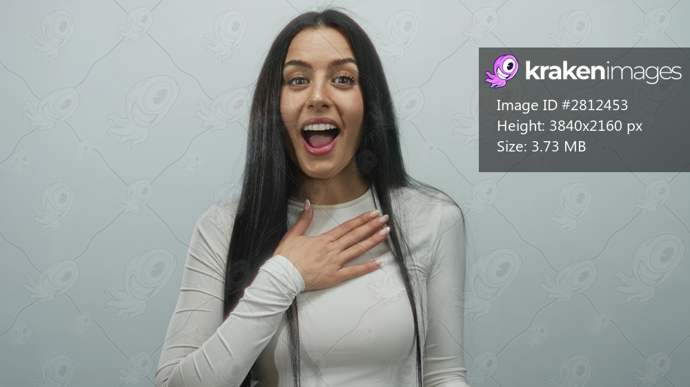 Woman with long black hair smiles and gestures joyfully over isolated white background wearing a white shirt reflecting happiness and excitement.
