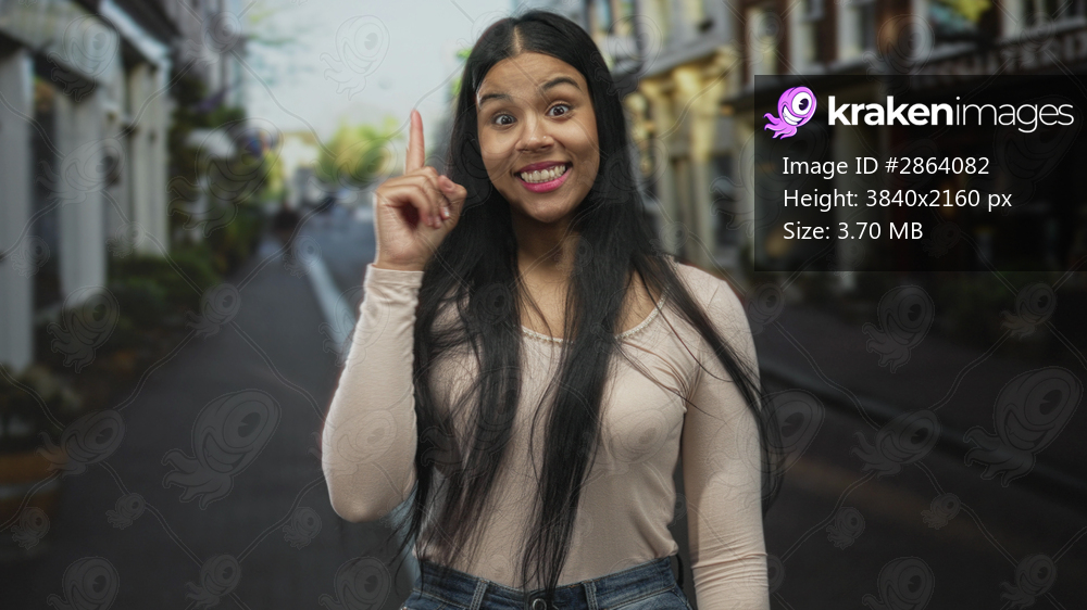 Woman with long black hair smiles and points finger upward on a bustling city street lined with shops; optimism.