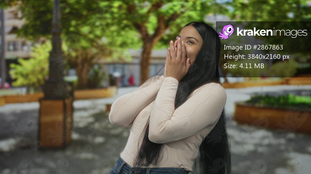 Woman with long black hair smiles while covering mouth gesture on street in lush green park; amusement.