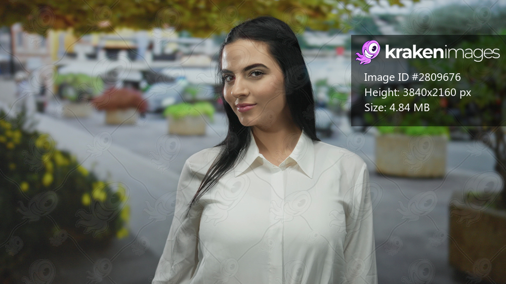 Woman with long black hair wearing a white shirt combing her hair with her hands on a vibrant street with greenery, evoking urban confidence and natural beauty. - Kraken Images
