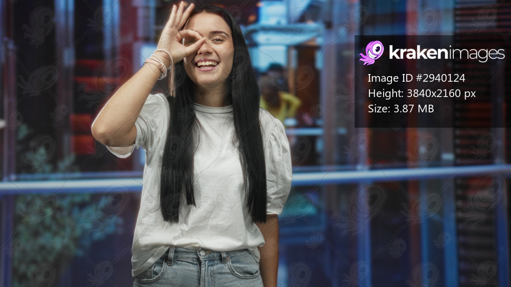 Woman with long black hair wearing a white t shirt and jeans makes ok sign around eye while smiling inside a modern glass building lobby; playfulness curiosity. - Kraken Images