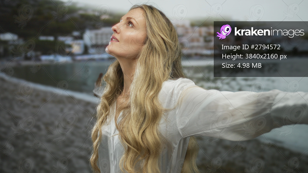 Woman with long blonde hair enjoying freedom at the seaside, embracing the serenity and beauty of the beach outdoors in a relaxed, joyful manner.