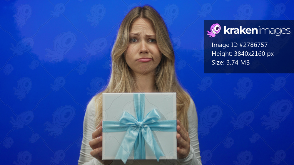 Woman with long blonde hair holding gift box with a pout in a blue photo studio; disappointment skepticism gloom melancholy.