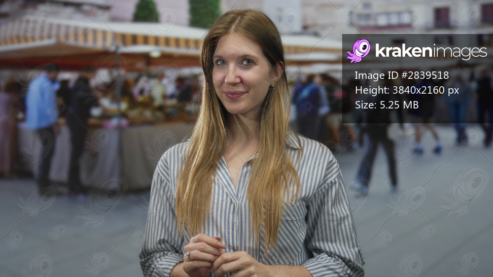 Woman with long blonde hair holds her clasped hands in front of her and smiles softly while looking down at a crowded street market; serenity.