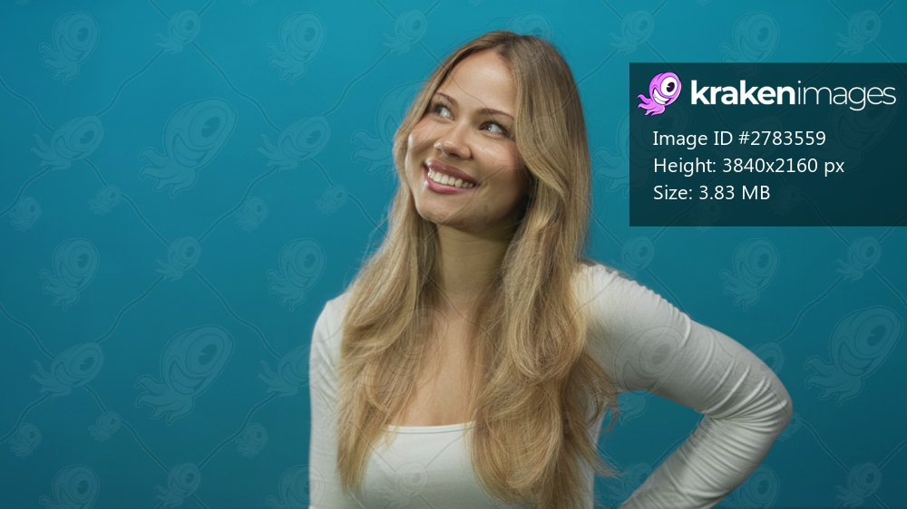 Woman with long blonde hair in white top with hand on hip in a studio portrait; confidence warmth joy optimism.