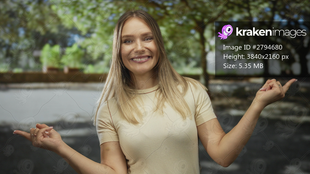 Woman with long blonde hair smiling and pointing in opposite directions with both hands in an outdoor park setting surrounded by trees and sunlight.