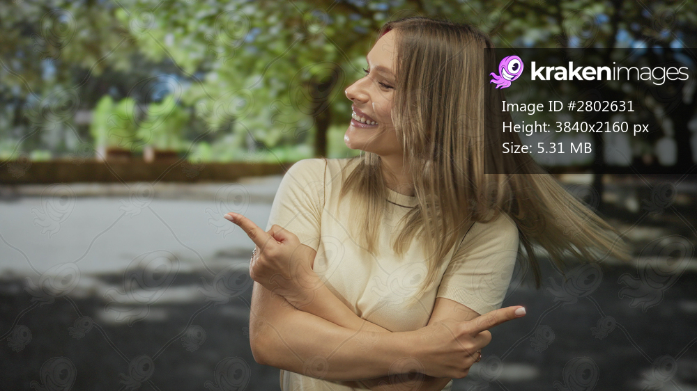 Woman with long blonde hair smiling and pointing in opposite directions with both hands in an outdoor park setting surrounded by trees and sunlight.