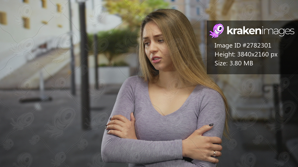 Woman with long blonde hair stands outdoors in a city street looking sad and thoughtful with arms crossed while wearing a casual grey top.