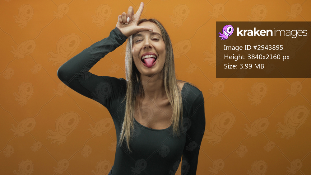 Woman with long blonde hair sticks out tongue and makes l sign with hand over forehead in orange studio; playful cheeky.