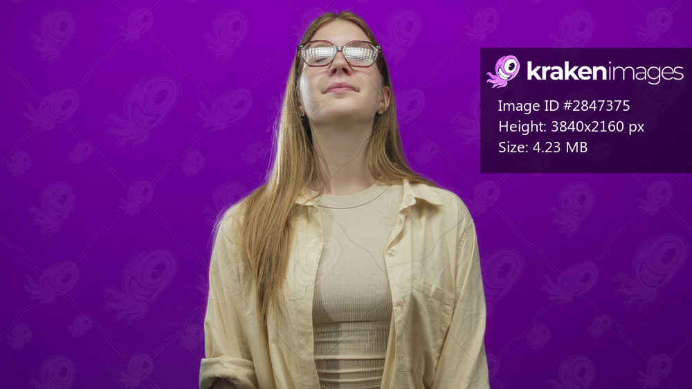 Woman with long blonde hair and subtle smile looks upward wearing glasses and beige shirt in purple studio; confidence self esteem.