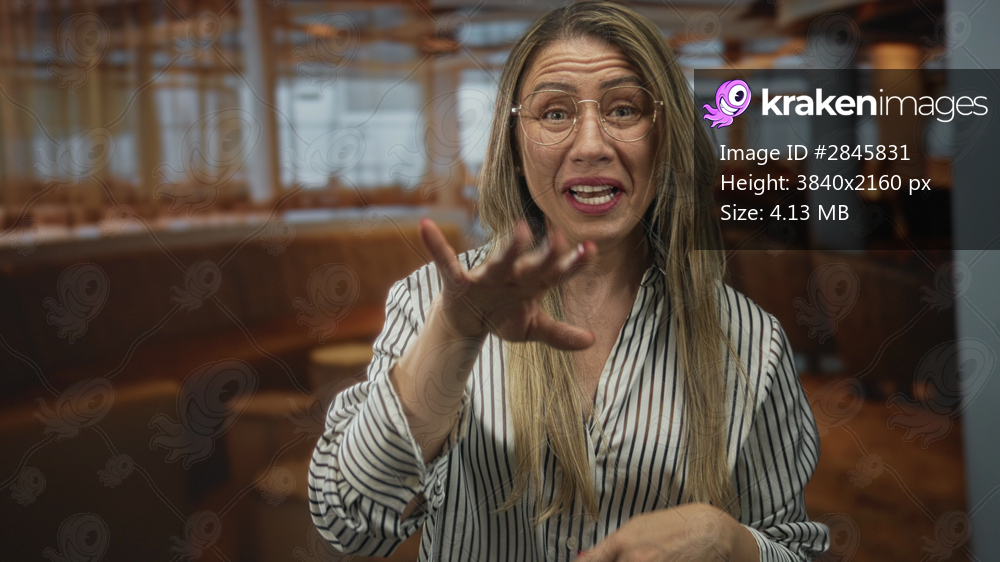 Woman with long blonde hair wearing round glasses and striped shirt with hand to lips gesture in building; shyness.