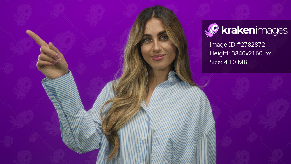 Woman with long blonde hair wearing striped shirt pointing finger to left in studio; confidence direction focus attention.