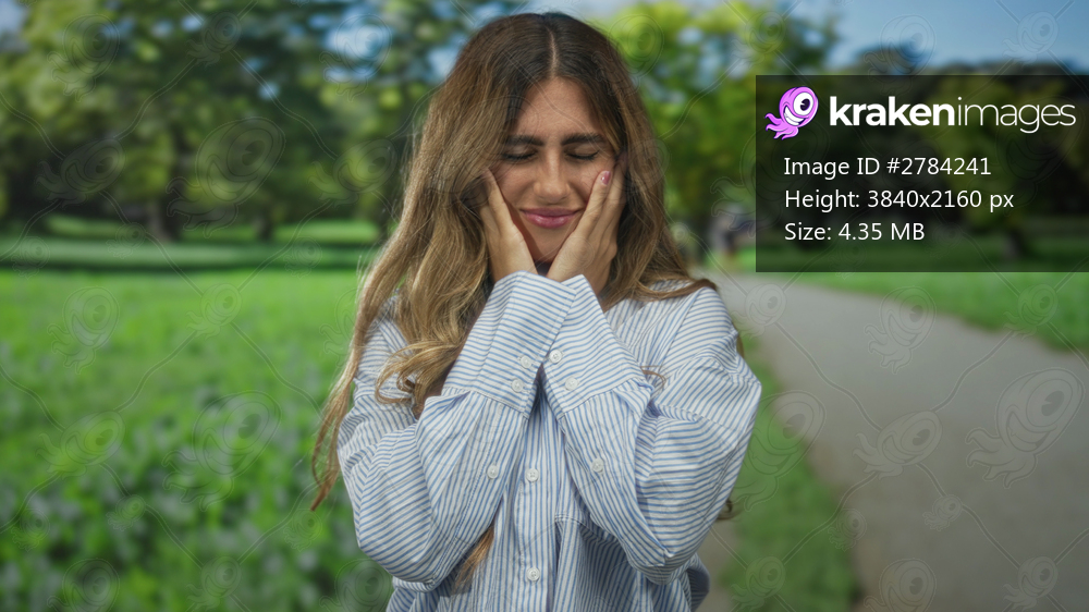 Woman with long blonde hair wearing striped shirt raises both hands beside head in sunlit park walkway; confusion frustration.